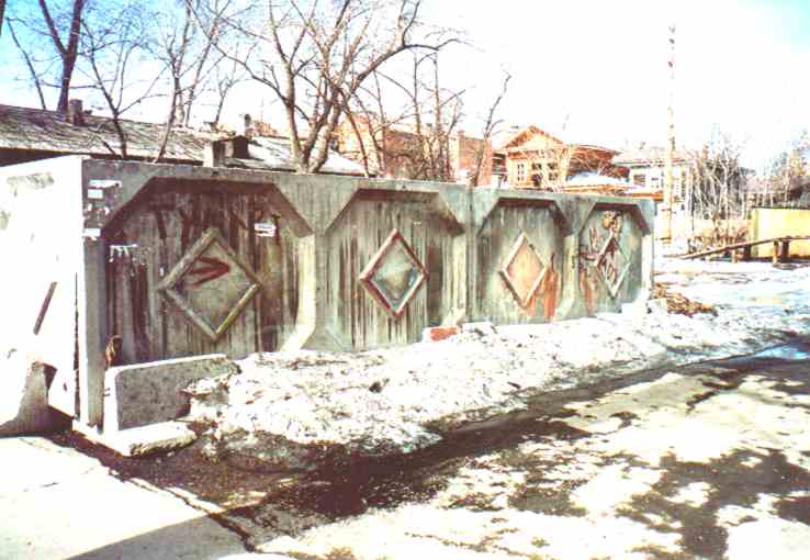 | 意図的に裏通りを通った。道はさらに汚くなり、荒れ果てた木造建築が多い。ただそれらの木造家屋も随所にロシア風の彫刻が施され、味がある。中国か日本の古ーい寺のような雰囲気がある。地盤沈下でこのあたりの建物は傾いているのだが、それを修正するように窓が枠ごと水平に取り付け直されていたりする。治安は基本的に悪そうだが別に取り立ててさらに悪いようなことはなかった。ただ、恐らくは普通の気分なんだろうけれども、ものすごい目つきをした朝鮮系の人達が多く、それが怖かった。ロシアでは、道ばたでタバコを一本おごると友達になれるの法則があるようで、後で自由市場の近くでとある辛抱強い人から辞書を使って一生懸命聞いた話だが、北朝鮮からの密入国の人達がひどい賃金で建設関係で働かされているんだそうだ。 | ![]() イルクーツクのあまりよくない地区 見にくいがトゥアリェートって書いてある。 行きたくない。 |
